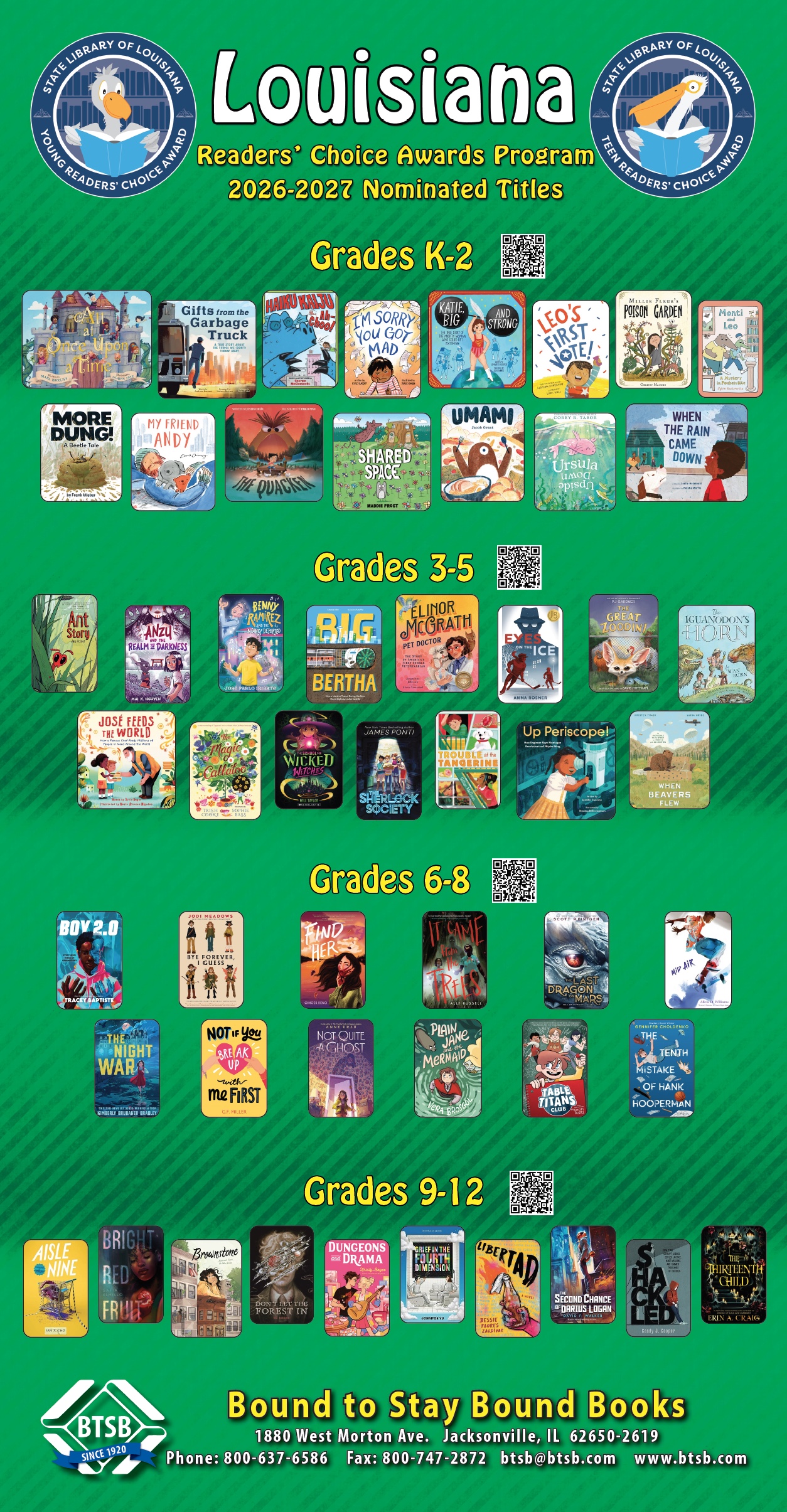 LA 2026-2027 Louisiana Young Readers’ Choice Award Grades K-2LA 2026-2027 Louisiana Young Readers’ Choice Award Grades 3-5LA 2026-2027 Louisiana Young Readers’ Choice Award Grades 6-8LA 2026-2027 Louisiana Teen Grades 9-12