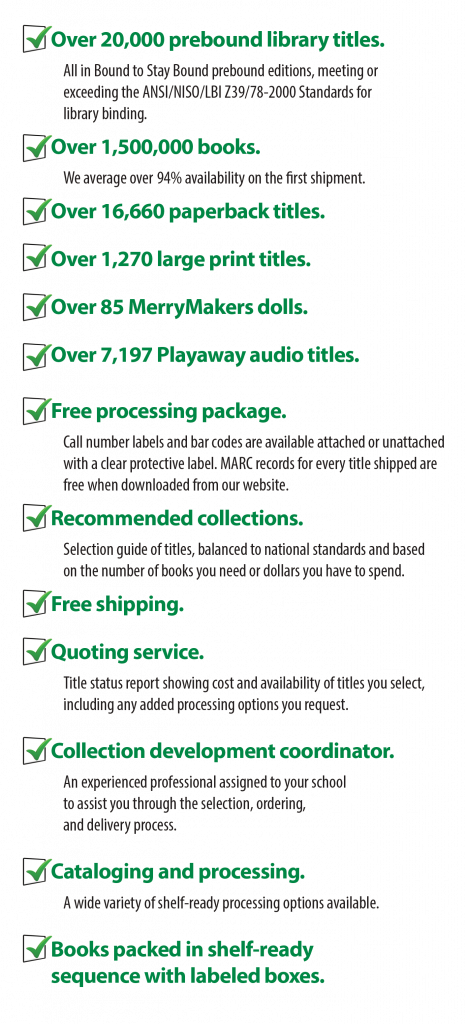 Each year, Bound to Stay Bound assists with opening hundreds of new schools and branch libraries throughout the country. With over 100 years of experience, BTSB can make your job easier and fill those shelves with the best prebound books on the market.