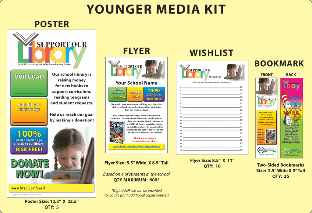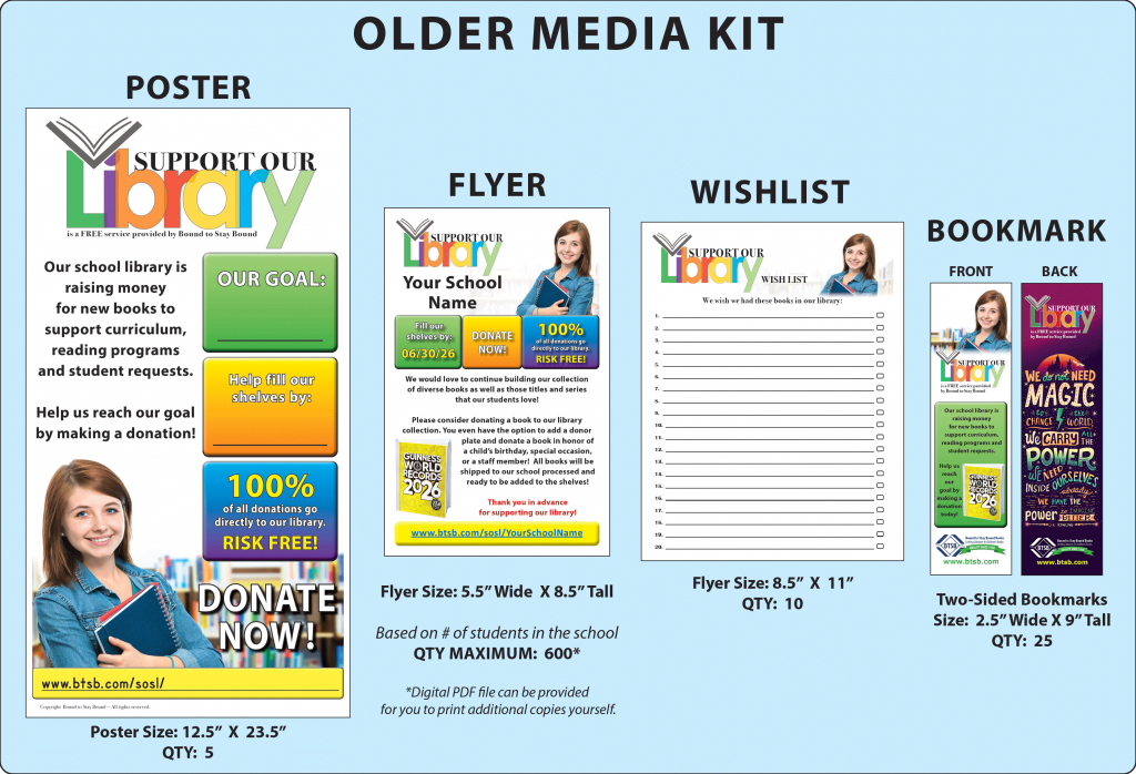 A Media Kit is what BTSB calls our FREE packets of printed material to help promote your Support Our Library Program.