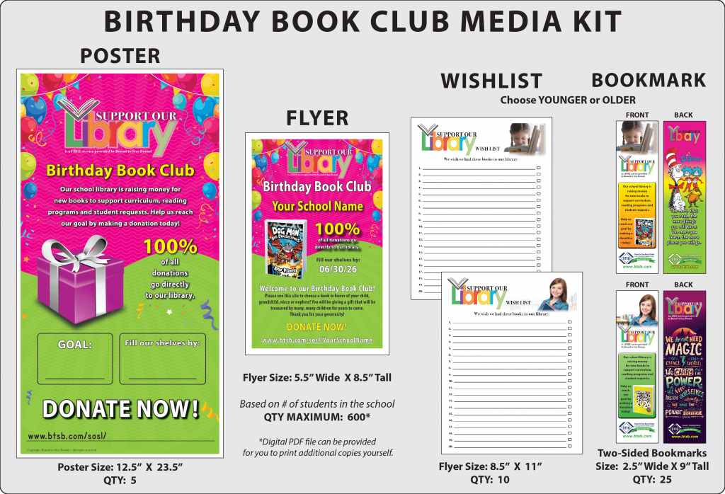 There are 3 types of Media Kits to choose from: Younger, Older, and Birthday Book Club.  Samples are Pictured Below.