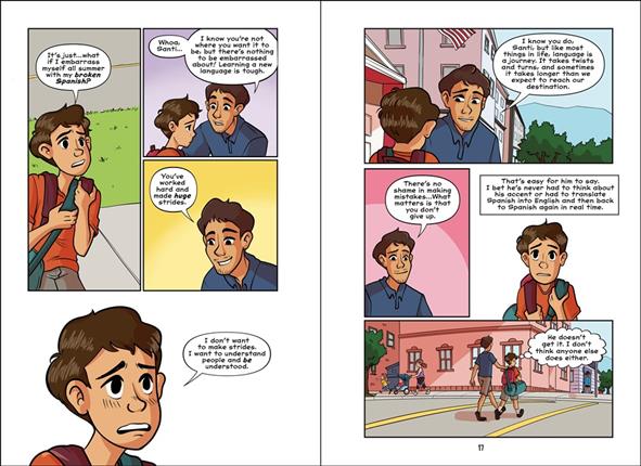 School Library Journal - 03/01/2025 Gr 3–7—Santi is spending a month with his abuela during the summer in an effort to improve his Spanish. Abuela Emma, who speaks more Spanish than English, has high expectations for Santi to learn as much as possible in his time with her. Santi has tremendous anxiety about his Spanish and his inability to speak but understands fluently. He is lucky enough to immediately make friends with four local kids who invite him to play in a soccer tournament. When Santi realizes Abuela lives in a Latin American community where everyone speaks Spanish, he loses what little confidence he had in his language skills and turns inward rather than toward family and friends. The story's outcome is heartwarming and hopeful, opening the door for the next installment in the series. Young readers will recognize and sympathize with Santi's insecurity and frustrations, and this graphic novel might serve as a mirror for students who feel caught between cultural expectations. Mendez's artwork is engaging and expressive, especially in the essential flashback panels showing Santi's treatment by some students back home. VERDICT An enjoyable story about learning Spanish and much more, this first installment in the "Hillside Valley" series is a perfect addition graphic novel collections.—Kim Gardner - Copyright 2025 Publishers Weekly, Library Journal and/or School Library Journal used with permission.
