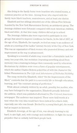 Full Text Reviews: School Library Journal - 01/01/2018 Gr 4–7—Hearth sets the stage in this middle grade biography with Elizabeth Jennings hoping to arrive on time at the First Colored American Congregational Church, where she was an organist, before pulling back to explain just what New York City looked, smelled, and operated like in 1854. Weaving together historical background with a portrait of Jennings, Hearth has created a compelling account of the court case Jennings vs. Third Avenue Railroad Company—an early landmark case in desegregating New York City transit. The engaging narrative is supported by plentiful archival maps, photos, and reproductions of primary source documents, such as handwritten reports and newspaper clippings. Sidebars also provide important historical context. The back matter is impressively long—including a six-page bibliography of websites, books, newspapers, journals and reports; extensive chapter and illustration notes; and more, making this a superb mentor text. VERDICT Hearth brings the story of Elizabeth Jennings to vivid life in an eminently readable book.—Brenda Kahn, Tenakill Middle School, Closter, NJ - Copyright 2018 Publishers Weekly, Library Journal and/or School Library Journal used with permission. Loading...