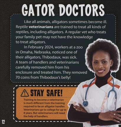 Alligators are meat-eating beasts that lurk along the edges of lakes, swamps, and rivers. Their powerful jaws are filled with fearsome teeth that can deliver a deadly bite to unsuspecting prey. In this educational and exciting book, readers will dive into the wild world of alligator handling. They'll find out what alligator handlers do and how they stay safe while performing this dangerous work.