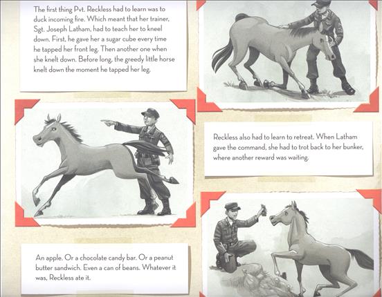 Full Text Reviews: Booklist - 07/01/2017 *Starred Review* With every war comes stories of heroism, and often those heroes are animals. In this case, it’s a little sorrel mare used to haul heavy ammunition by U.S. soldiers during the Korean War. The ammo, for the new “reckless” rifle, proved too heavy for soldiers, so Lt. Eric Pedersen set out to find a mule and instead found a small, hungry horse. Though the marines had doubts about her ability to haul the heavy loads, they dubbed her Private Reckless and began her training. It quickly became apparent that not only did Reckless have a large heart, she’d also consume anything—including chocolate, Coca-Cola, and poker chips. Fears that Reckless would prove skittish in battle proved unfounded, and she soon became a valuable soldier, persevering in battles that would determine the course of the war. Eventually, Reckless was promoted to sergeant, making her the only animal to hold military rank, and was granted two Purple Hearts at the end of the war. McCormick (The Plot to Kill Hitler, 2016) offers up her first picture book, and it’s a rousing success; the Korean War is covered less frequently than its Vietnam and World War counterparts, and there’s plenty of fascinating information here. If that weren’t enough, Bruno’s bold pencil illustrations range from endearing depictions of the inquisitive (and perpetually hungry) Reckless to somber battle scenes. An engaging slice of history. - Copyright 2017 Booklist. School Library Journal - 08/01/2017 Gr 1–5—At the height of the Korean conflict, a young racehorse was abandoned and left hungry at a racetrack. Around the same time, a nearby U.S. Marine unit was exhausted from lugging heavy ammunition uphill during their battles. While a mule would have been preferable, Sergeant Pederson trained that once-abandoned horse to carry the ammunition for the Marines—and what followed is a remarkable story. Named Reckless, she carried herself with aplomb under the roughest of combat conditions, in one battle she made 51 trips and carried 9,000-pounds of ammunition. Meanwhile she ate everything and anything, waking up the company cook to get her breakfast. Reckless would eventually attain the rank of Staff Sergeant in the U.S. Marine Corps. McCormick's narrative is excellent and Brunos's bold illustrations contribute to the story as much as the text. The work concludes with a synopsis of Reckless's retirement in the United States. While Melissa Higgins's Sgt. Reckless the War Horse: Korean War Hero is a suitable title, McCormick's is more exciting. VERDICT This well-illustrated war story will appeal to many, especially fans of Michael Morpurgo's War Horse. A strong selection.—Margaret Nunes, Gwinnett County Public Library, GA - Copyright 2017 Publishers Weekly, Library Journal and/or School Library Journal used with permission. Loading...