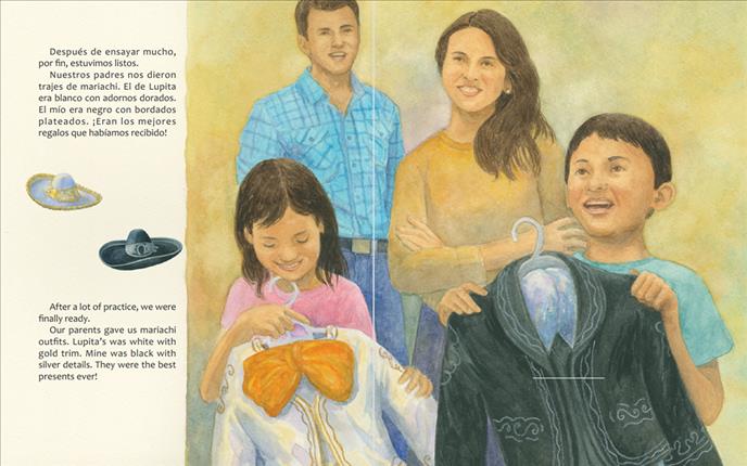 School Library Journal - 10/01/2025 K-Gr 3—This bilingual picture book tells the story of a brother and sister who want to become mariachis. Joselito and Lupita, two Latinx children, hear mariachis at a party and decide they want to sing and dress up like the musicians. After being laughed at by their classmates, the majority of whom are white with a few kids of color, and encouraged by their Latinx teacher, they begin to practice. They receive mariachi outfits and begin performing. The two children do not give up and achieve their goal. The story is told from Joselito's point of view and conveys an optimistic attitude. The artwork appears to be done colored pencil and captures the emotions of the characters. Close-ups of the characters' faces are expressive and clear. The illustrations are done in soft colors and include cloudlike backgrounds that match the characters' outfits. VERDICT This bilingual book about children pursuing their dreams is a strong purchase where libraries are filling gaps in their bilingual collections. Otherwise, it's an additional purchase.—Margaret Puentes - Copyright 2025 Publishers Weekly, Library Journal and/or School Library Journal used with permission.