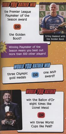 Would you rather be known for making the hardest penalty kicks or for blocking penalty kicks? Would you rather score with a header or a bicycle kick? Young readers will love answering these and other questions about pro soccer. From amazing plays to soccer stars and the World Cup, everything kids love about the sport is covered!