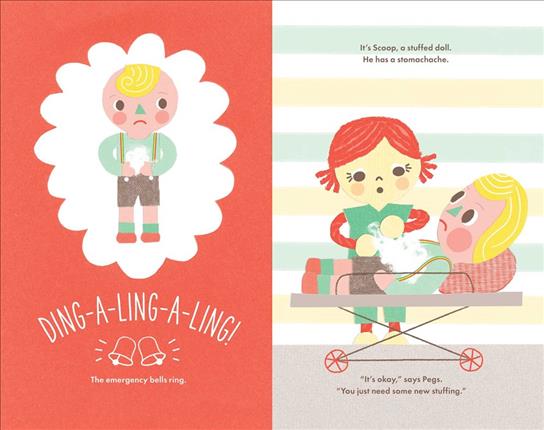 Booklist - 04/15/2018 Dr. Pegs, with red pigtails and wide brown eyes, is planning a slow day at the doll hospital, organizing buttons. But that’s before the doorbell rings—one, two, three, four times. First, it’s Portia, a porcelain doll who needs some glue for her arm. Then the “ding-a-ling” announces Scoop, who has a stomachache. And why not? His stuffing is falling out. The next arrival is a baby doll, and in need of help, he can only say moo instead of mommy. The final arrival is a bear in need of a button—he’s lost an eye. Dr. Pegs (who looks like the other round-faced, simply shaped toys) must ring the emergency bell. She needs help! A quintet of Russian nesting dolls, all dressed as nurses, assist in getting the procedures done. The illustrations, made of cut paper, cloth, stuffing, ink, and digital techniques, give a three-dimensional look to the artwork and provide a symmetry of shape and color, primarily reds, greens, buffs, and browns. If a hospital visit can be fun, it’s this one. - Copyright 2018 Booklist.