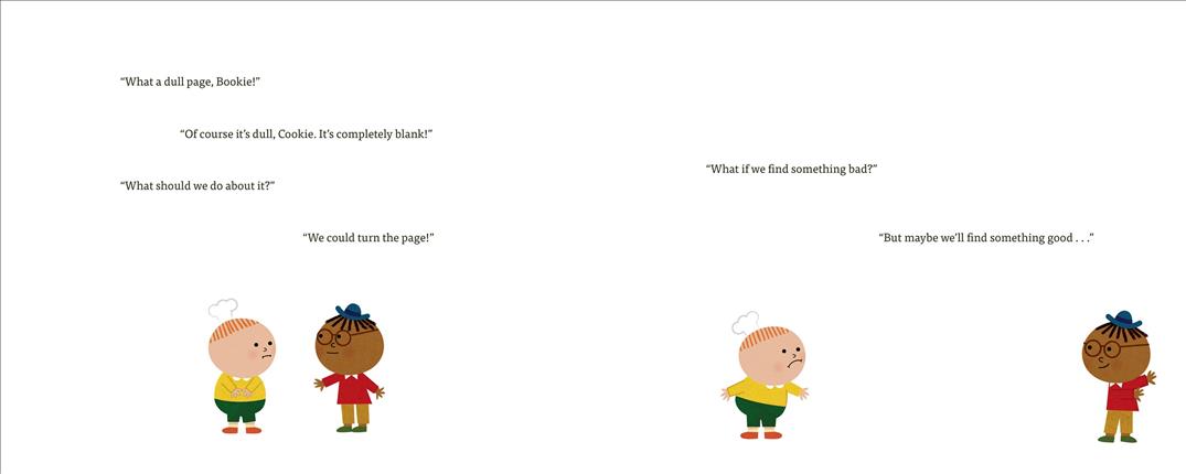 Best friends Bookie and Cookie find their blank page boring, but when Bookie suggests turning it, cautious Cookie fears what might come next, and Bookie must encourage him to embrace the unknown. Companion to Bookie & Cookie.