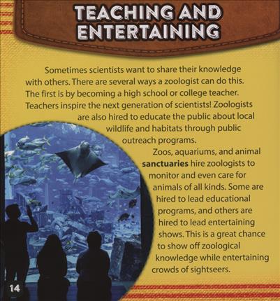 Zoologists are animal experts. They study animal behavior and their interactions with the world around them, as well as the behavior of animals in captivity. Many work for zoos and aquariums, but that's not all. Many zoologists work in the field in a variety of environments and conditions, ranging from state parks to fisheries. Zoologists may have a degree in biology, ecology, wildlife conservation, and other closely related scientific areas, and most specialize in a specific field.