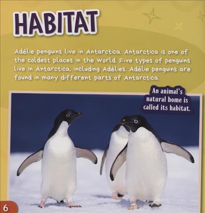 Adelie penguins are the smallest kind of penguin found in Antarctica. They only grow to about 12 pounds! Adelie penguins are excellent swimmers and hunt for krill, fish, and squid in the waters around their frozen home. Contains concepts of habitats, life cycles, body adaptations, and diet of the Adelie penguin.