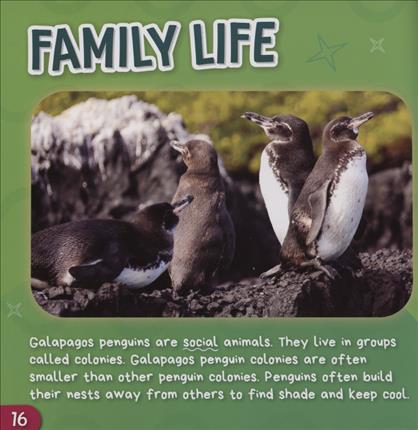 Readers may be surprised to learn that not all penguins live in the icy cold of Antarctica! In fact, Galapagos penguins make their homes on the Galapagos Islands, which are near Ecuador. One of the smallest kinds of penguin, these birds are fascinating to learn about! One fun fact is that they live in caves that were made by lava! Readers learn other essential information such as the Galapagos penguin's habitat, body adaptations, diet, and life cycle.