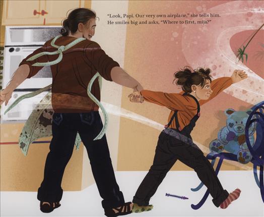 Other - 03/24/2025 In Morera and Encarnaci?n’s wistful bilingual story, imagination-fueled play helps "chase the blues away" for a father and child. Taking inspiration from previous dreams of adventure ("The ones from before./ When Mami was here"), Papi and young Gisele travel to a pink sand beach via a plane full of stuffies and give a concert on the moon, among other fantastic explorations. With painted textures and scanned elements, artwork centers on the duo’s shared affection-particularly captured in a scene of the two curled up on the couch, paging through a photo album ("a book that lets you travel through time"). Traces of Mami, too, appear throughout this loving work about a family’s bond. Characters cue as Latinx. An author’s note concludes. Ages 4-8. (May) - Copyright 2025