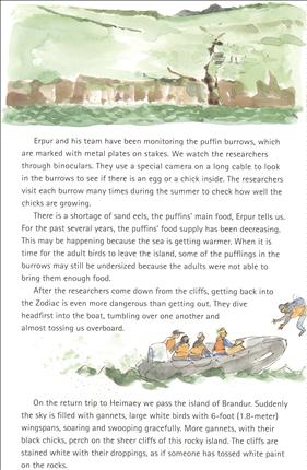 Bulletin for the Center... - 05/01/2012 Using text, field sketches, and full-page watercolor illustrations, husband and wife team Ted and Betsy Lewin detail their visit to the island of Heimaey (off the coast of Iceland). They accompany two child members of the “Puffling Patrol” (who rescue newly hatched puffins that become disoriented and lost on their way to the sea) and observe as the children find, care for, and release the baby pufflings. Although the Lewins’ narrative is somewhat dry, the clear writing and measured tone help make this exotic event accessible for children who have no prior knowledge of this locale or annual event. Kids will also appreciate the child-hero aspect of the tale, and animal lovers will particularly enjoy following the details of the puffling rescue and release process. Occasionally, stiffly posed human figures or garish coloring cause the otherwise effective full-page watercolor illustrations to stumble, but the field sketches (done in pen and ink and watercolor) are wonderfully vigorous and expressive with just a minimum of detail; the two different illustrative styles clash more than complement, but kids eager for the puffling details may not be bothered by the visual mismatch. The Lewins’ outsider perspective gives this title a slightly different approach than McMillan’s photo-illustrated Nights of the Pufflings (BCCB 3/95), which drops readers right into the action; while McMillan’s is the more gripping account of the two, the Lewins’ book is certainly a useful companion title. End matter includes additional facts about puffins and the island, a bibliography, and a helpful glossary and pronunciation guide. JH - Copyright 2012 The Board of Trustees of the University of Illinois.