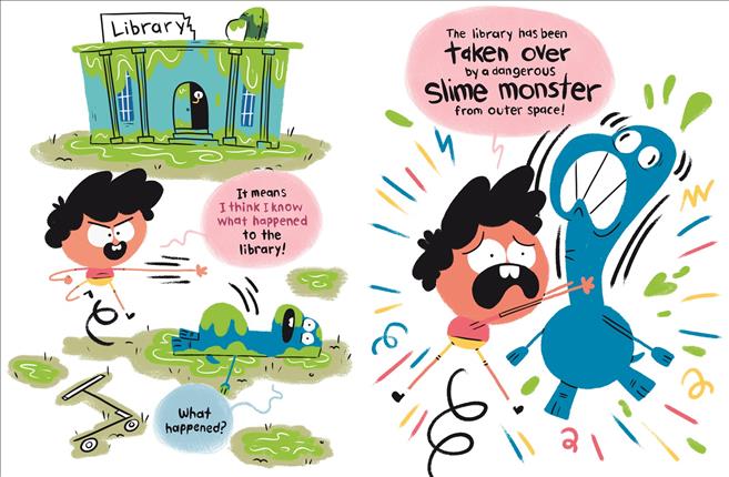 Hugo, who can transform into anything, and his best friend Dino must stop an alien slime monster from destroying their local library's books as part of a plot to take over the world. In graphic novel format.