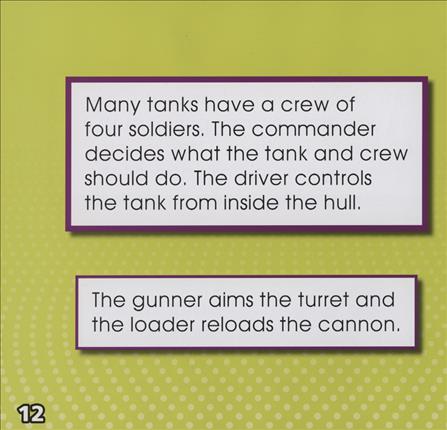 Did you know that the body of a tank is called its hull? Many tanks have a crew of four soldiers. Learn more fascinating facts in Tanks. Buy one BTSB Prebound and get 17 audio ebooks in 17 different languages for free accessed through the book code.